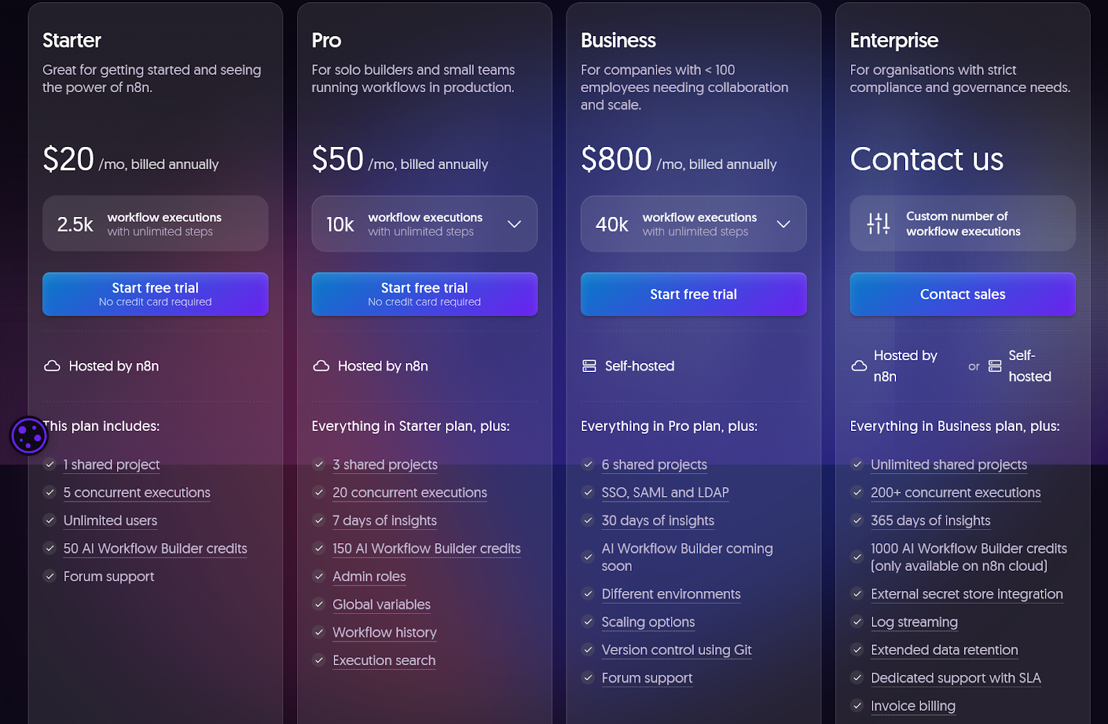 - Pro: $50/month billed annually for 10,000 workflow executions