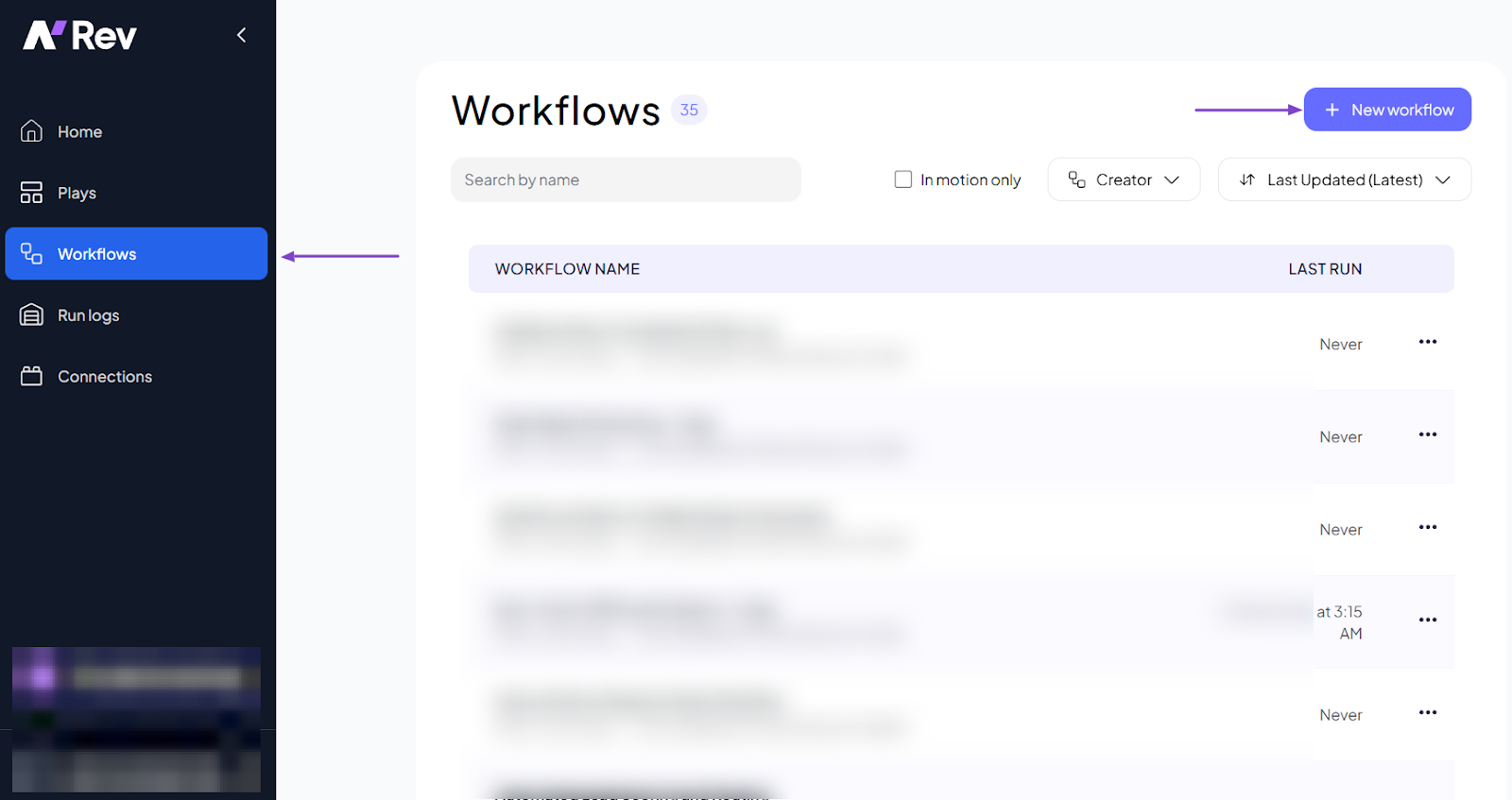 After signing up, go to Workflows in the sidebar menu, then click “New workflow” on the far right.
