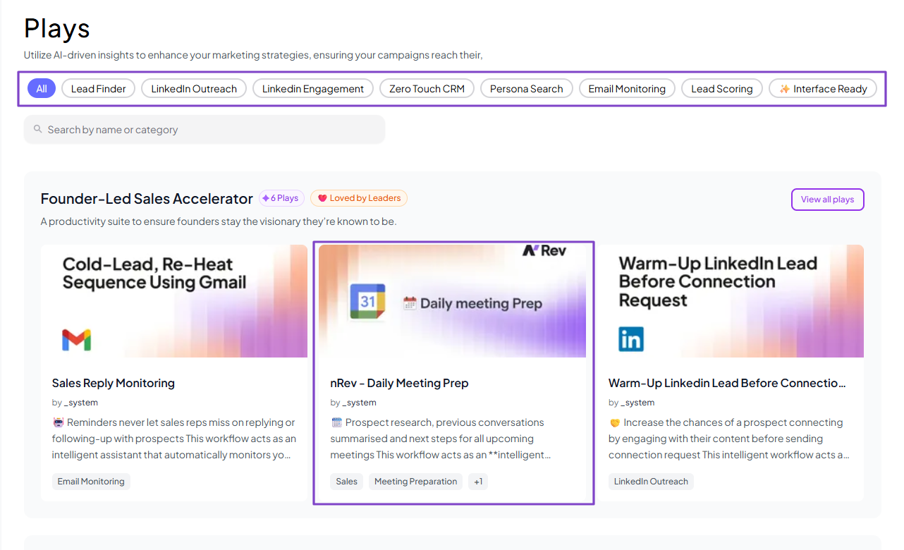Plays are pre-built GTM workflows powered by AI agents. You don’t need to create a workflow from scratch since there are many available.