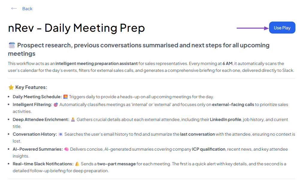 Let’s choose the “nRev - Daily Meeting Prep” play.