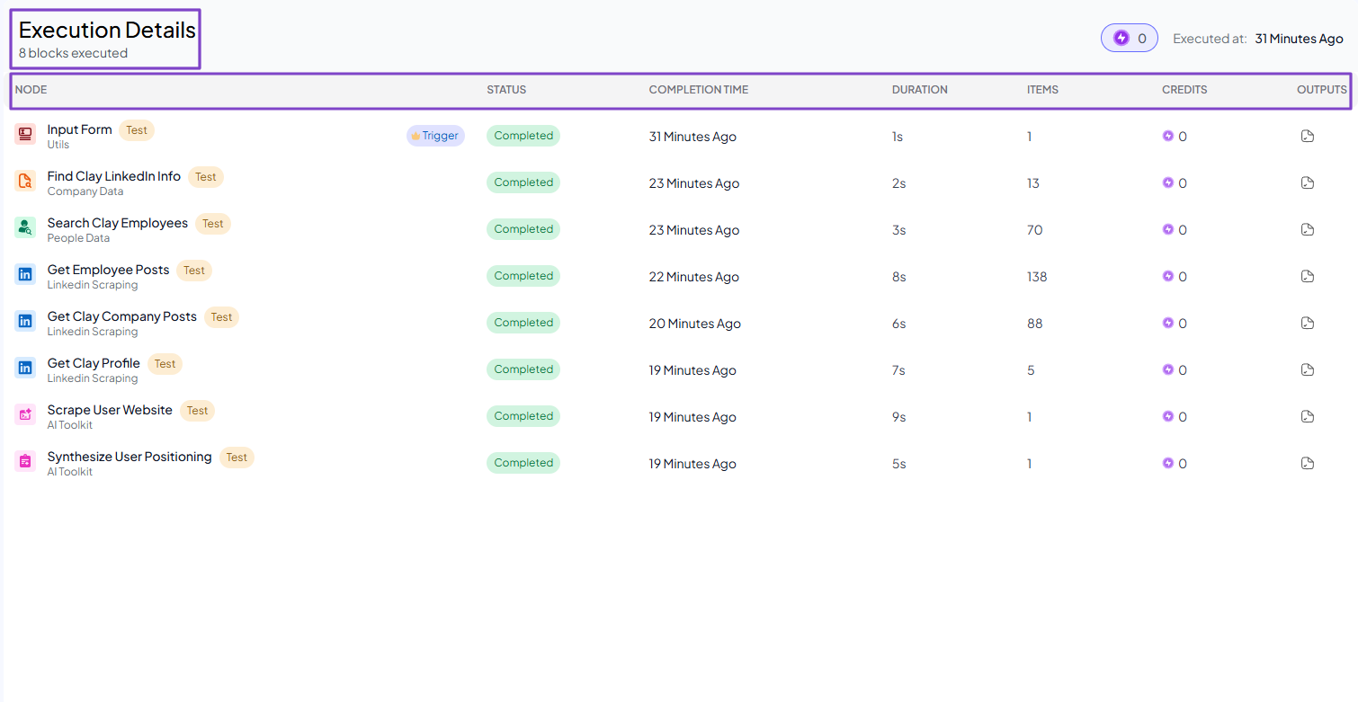 You can click a workflow to see more execution details. Like the exact nodes used, their status, completion time, duration, items, credits, and outputs.