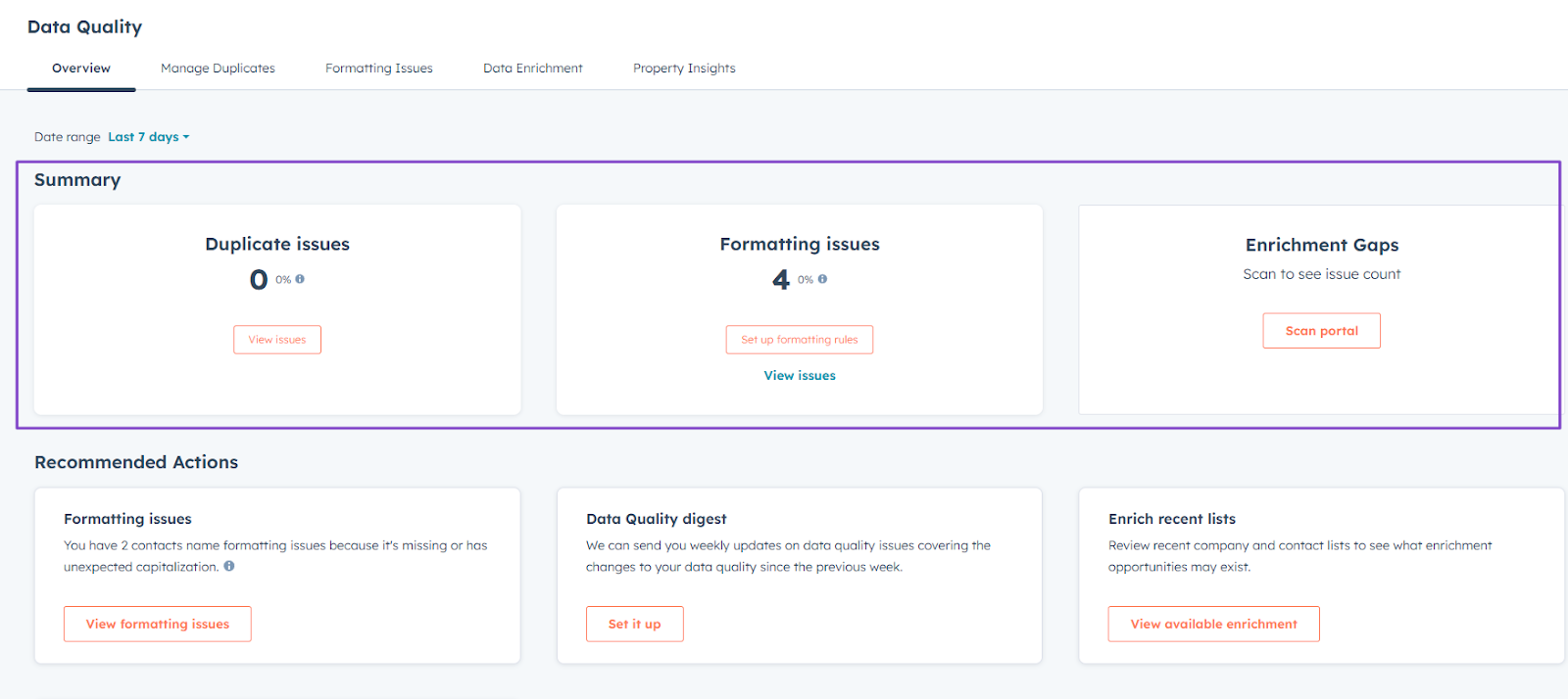 You will have an overview of your data quality: number of duplicate issues, formatting issues, and enrichment gaps.