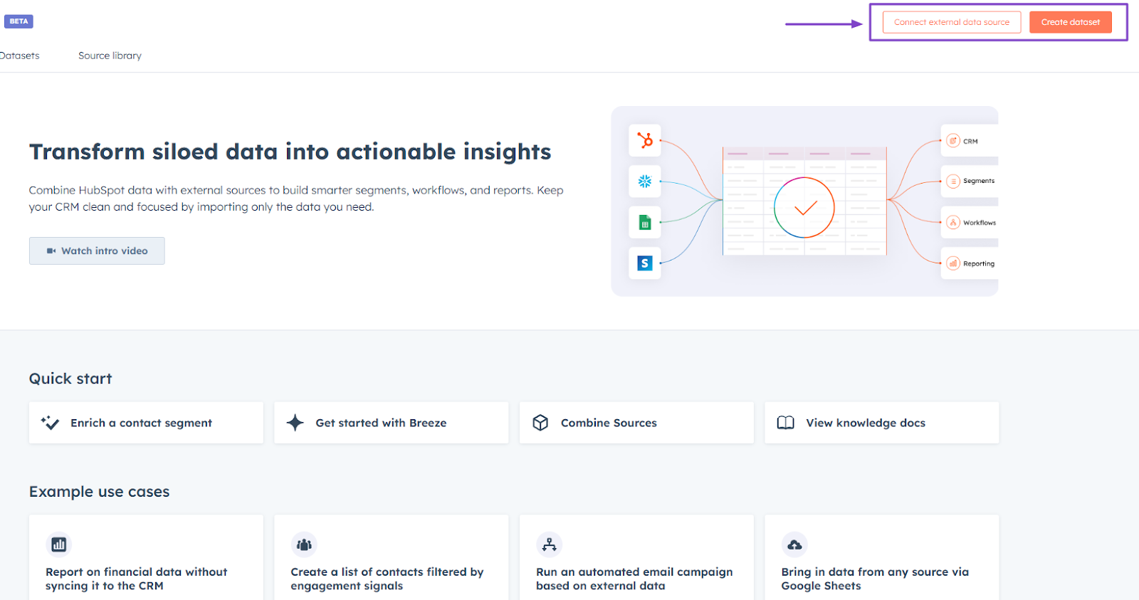 This feature in the HubSpot data hub lets you combine data with external sources to build reports, workflows, or segments.