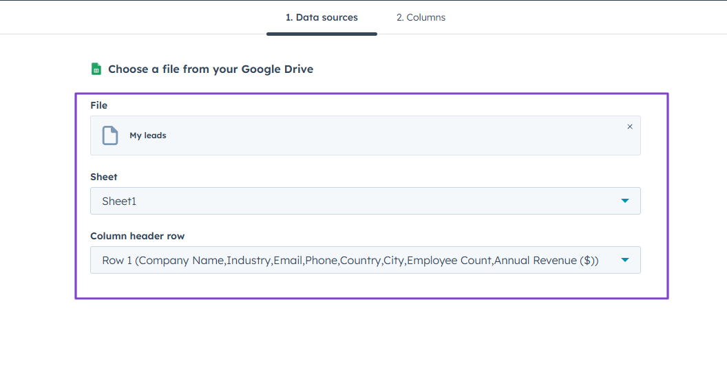 Say you select Google Sheets, you will need to choose a specific file for HubSpot to import. It’ll show the file name, sheet, and column header row.