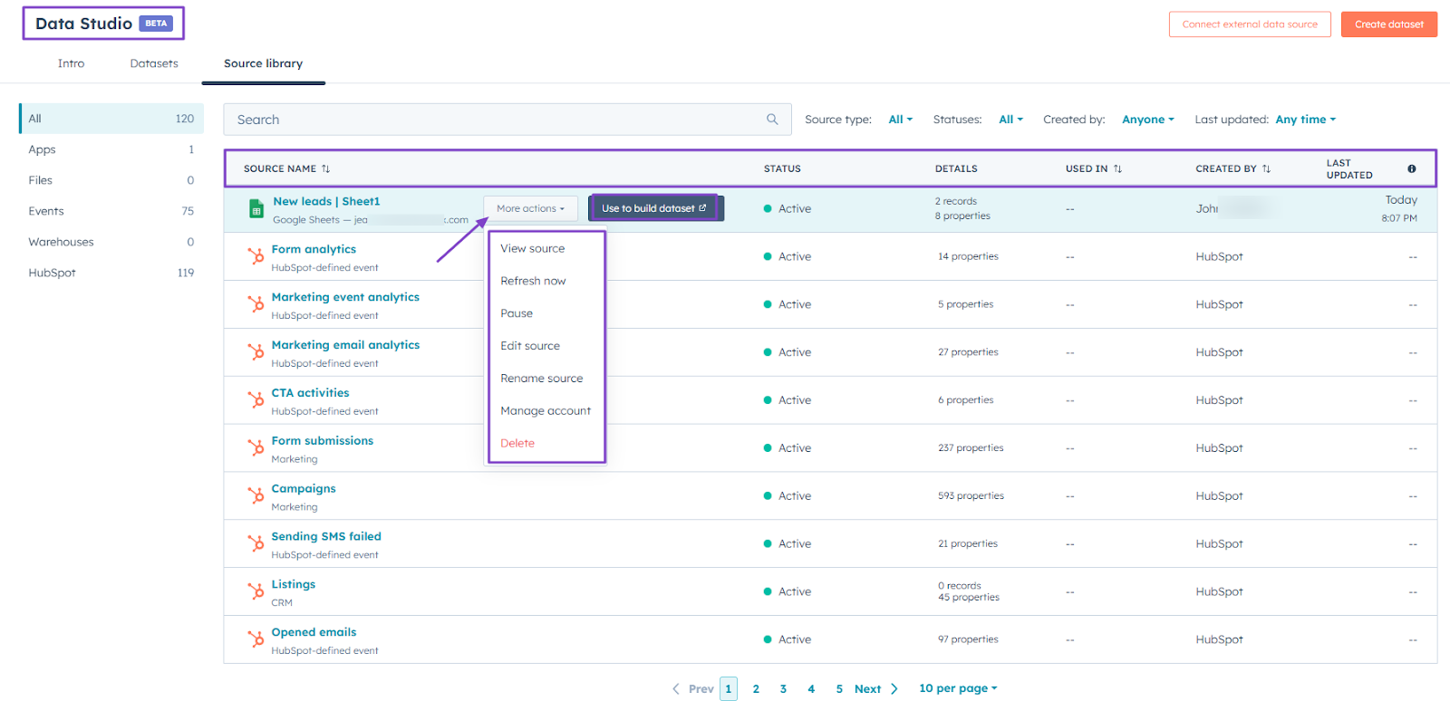 In the Data Studio window, you will see the source name, status, details, where it was used, who created it, and when it was last updated.