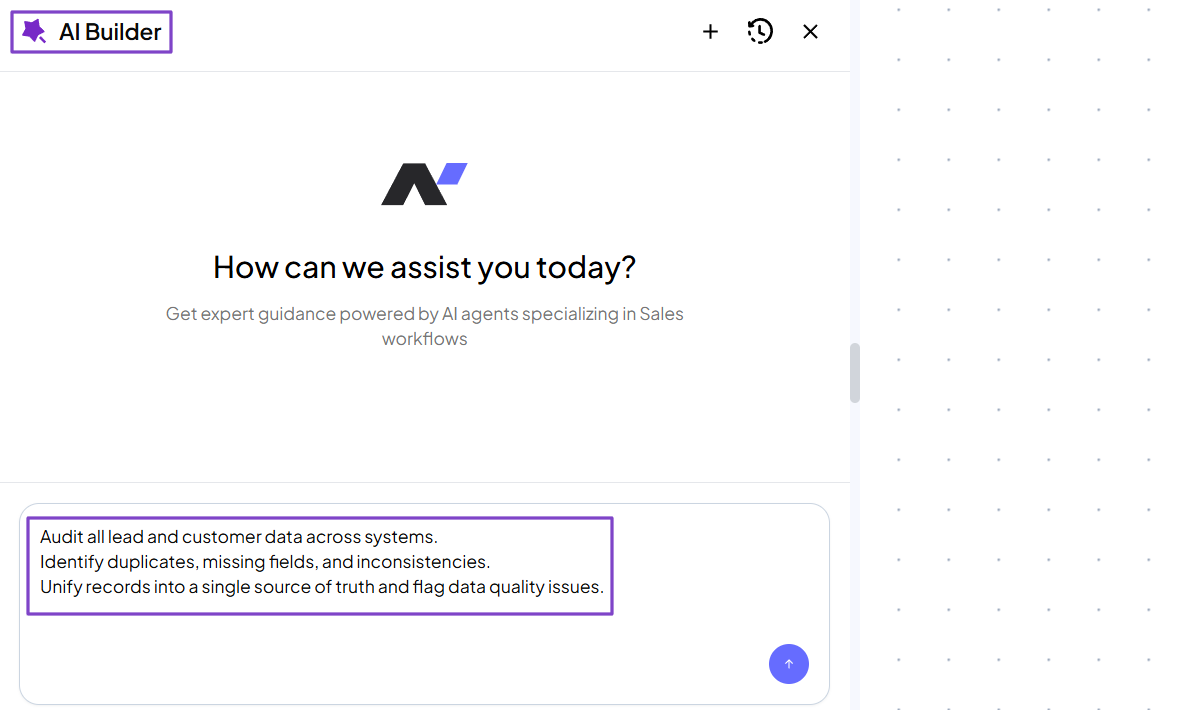 “Audit all lead and customer data across systems. Identify duplicates, missing fields, and inconsistencies. Unify records into a single source of truth and flag data quality issues.”