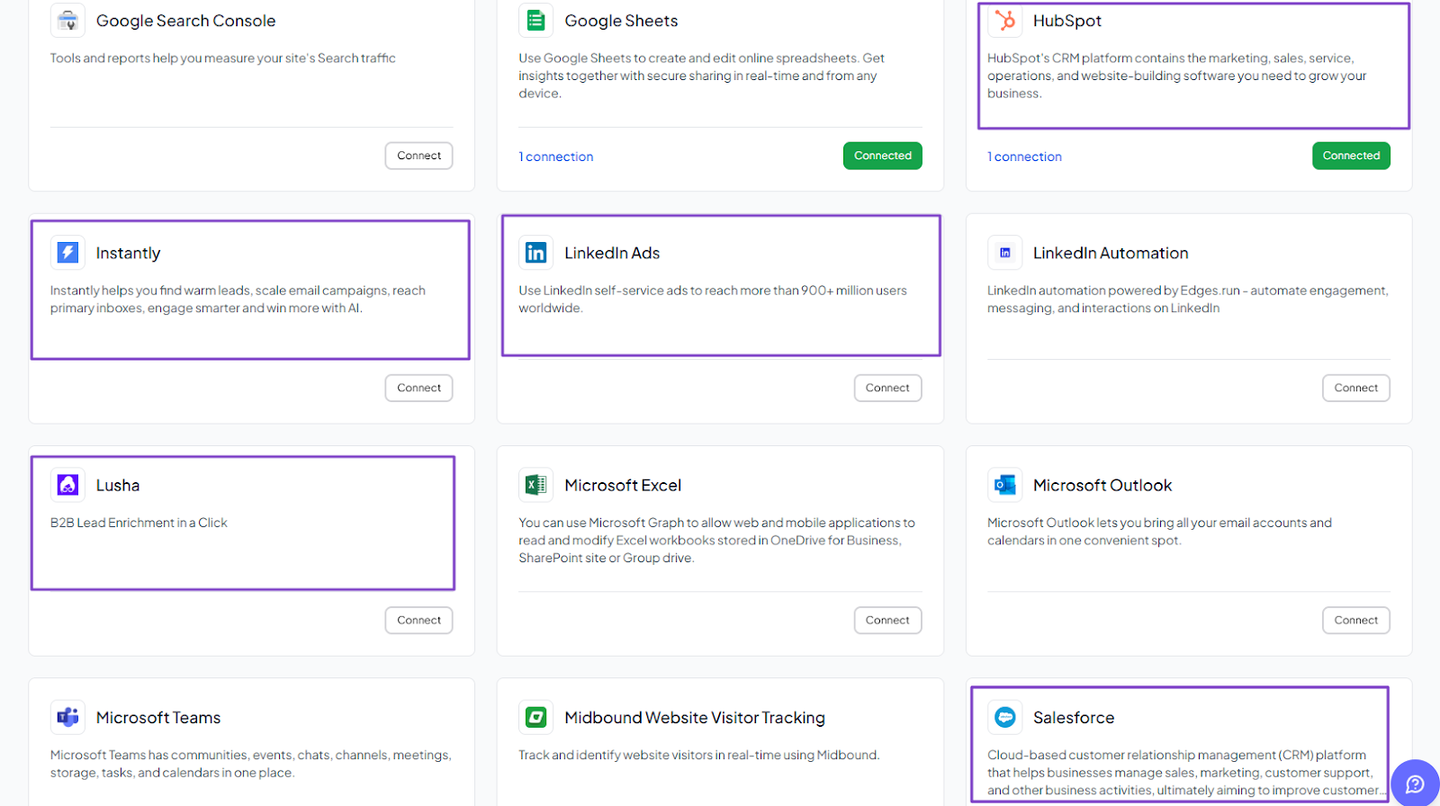 Tool integrations like HubSpot, Salesforce, LinkedIn Ads, Instantly, Lusha, and Slack help RevOps teams stay aligned.
