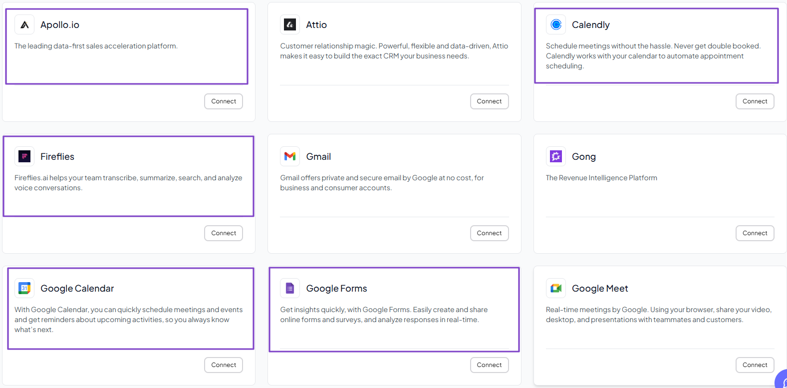 The right revenue operations software should integrate with tools like Apollo.io, Fireflies, Google Calendar, Google Forms, and Calendly.
