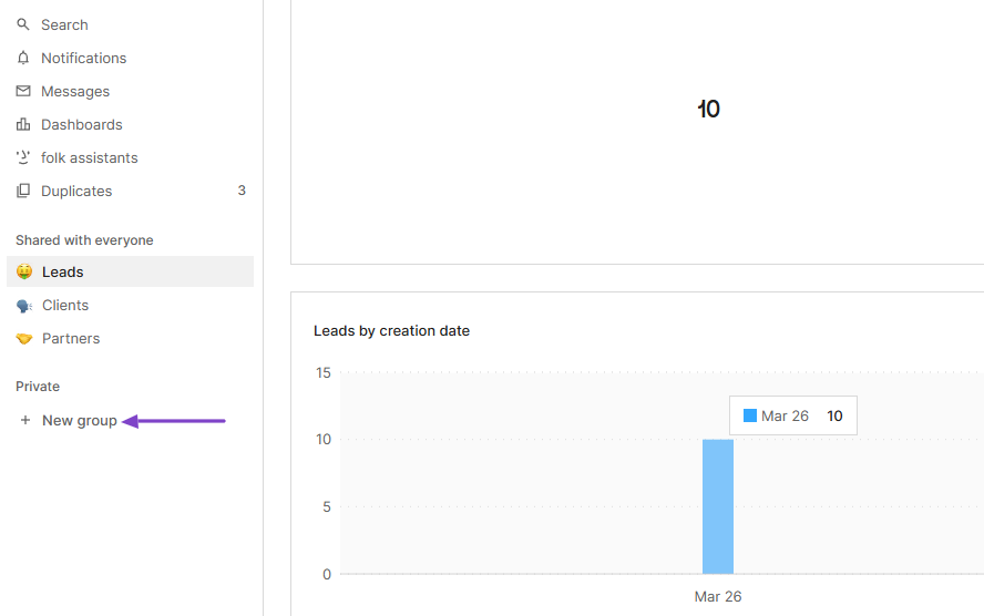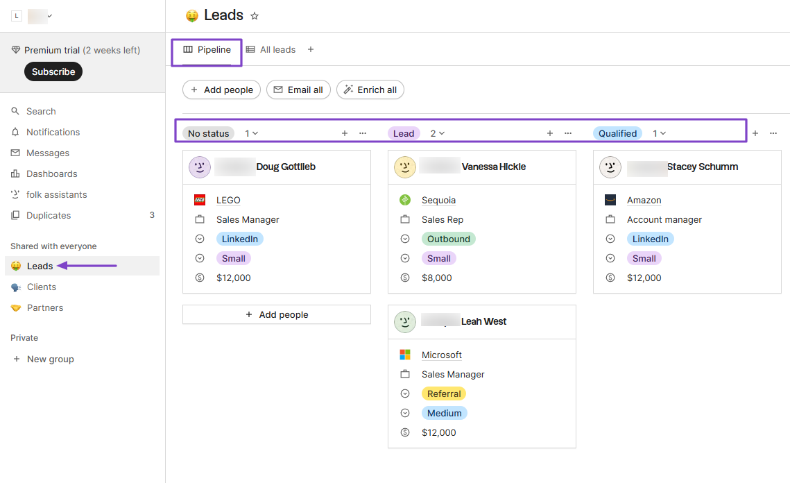Folk also allows you to add contacts manually. You simply enter their first and last name, email, phone number, and job title.