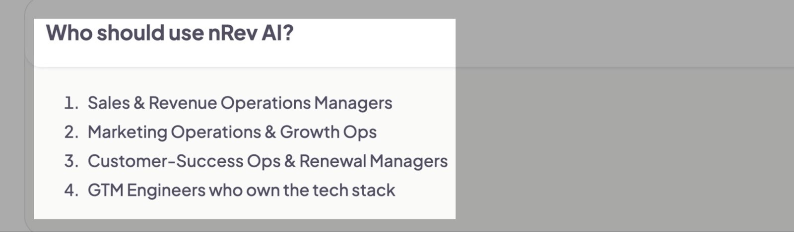 nRev AI is best suited for GTM teams and RevOps teams. However, SaaS founders, startup CEOs, SDR managers, and heads of sales can also benefit from it.