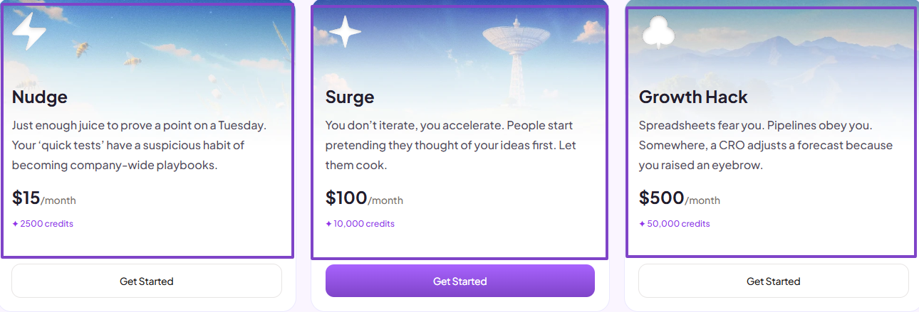 The first plan, Nudge, costs $15/month. It gives you 2,500 credits. And Surge, which is the next tier, is $100/month for 10,000 credits. Our last plan costs $500/month and gives you access to 50,000 credits.